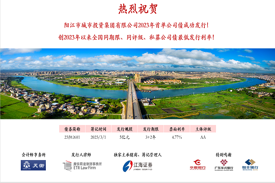 2023年3月1日,市城投集團(tuán)2023年面向?qū)I(yè)投資者非公開發(fā)行公司債券在深圳證券交易所成功發(fā)行,規(guī)模5億元,期限5年(3+2年),票面利率4.77%,創(chuàng)2023年以來(lái)全國(guó)同期限、同評(píng)級(jí)私募公司債最低發(fā)行利率。這是市城投集團(tuán)繼去...