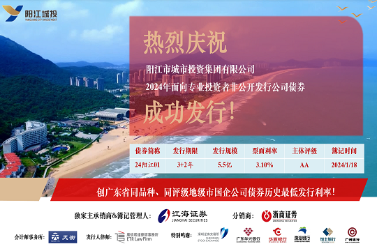 2024年1月19日,市城投集團(tuán)在深圳證券交易所成功發(fā)行“陽(yáng)江市城市投資集團(tuán)有限公司2024年面向?qū)I(yè)投資者非公開發(fā)行公司債券”。本期債券發(fā)行規(guī)模為5.5億元,期限為5(3+2)年,票面利率3.10%,全場(chǎng)認(rèn)購(gòu)倍數(shù)超過(guò)4.8倍,是...